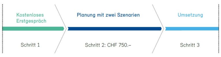 Beim kostenlosen Erstgespräch wird der Umfang der Planung definiert. Die Ausarbeitung von zwei Szenarien kostet CHF 750.–. Weitere Anpassungen/Szenarien werden nach Aufwand (CHF 150.–/Stunde) verrechnet. Im Anschluss an die Gesamtberatung steht Ihnen die Bank SLM auch bei der Umsetzung zur Seite. Bei Bedarf wird die Planung zu einem späteren Zeitpunkt wieder den aktuellen Gegebenheiten angepasst.